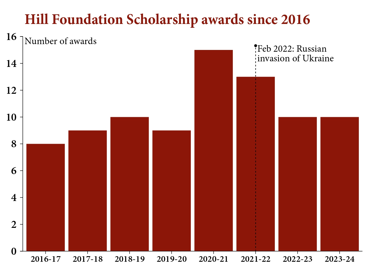 The Hill Foundation Scholarship is a programme that supports Russian nationals and residents pursuing a second bachelor’s degree, full-time master’s or DPhil. Since the Russian invasion of Ukraine in 2022, around ten scholarships per year have been awarded to students.