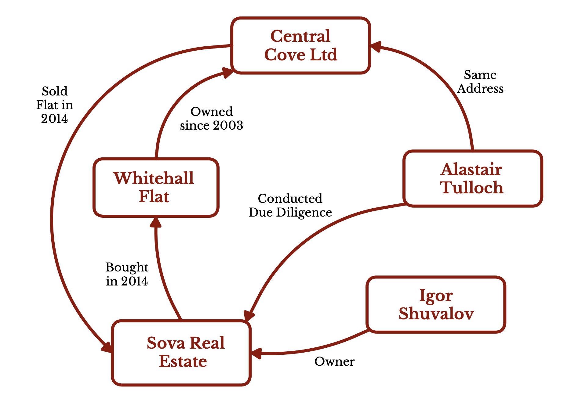 This, however, was not the end of Tulloch’s law firm involvement in “fixing” the housing for Shuvalov. In 2014 the flat was bought by Sova Real Estate LLC, a company owned by Shuvalov and his wife Olga. During registration of the company, the due diligence was conducted by none other than Tulloch & Co (now known as TGW law) and the person with overall responsibility was Alastair Tulloch.