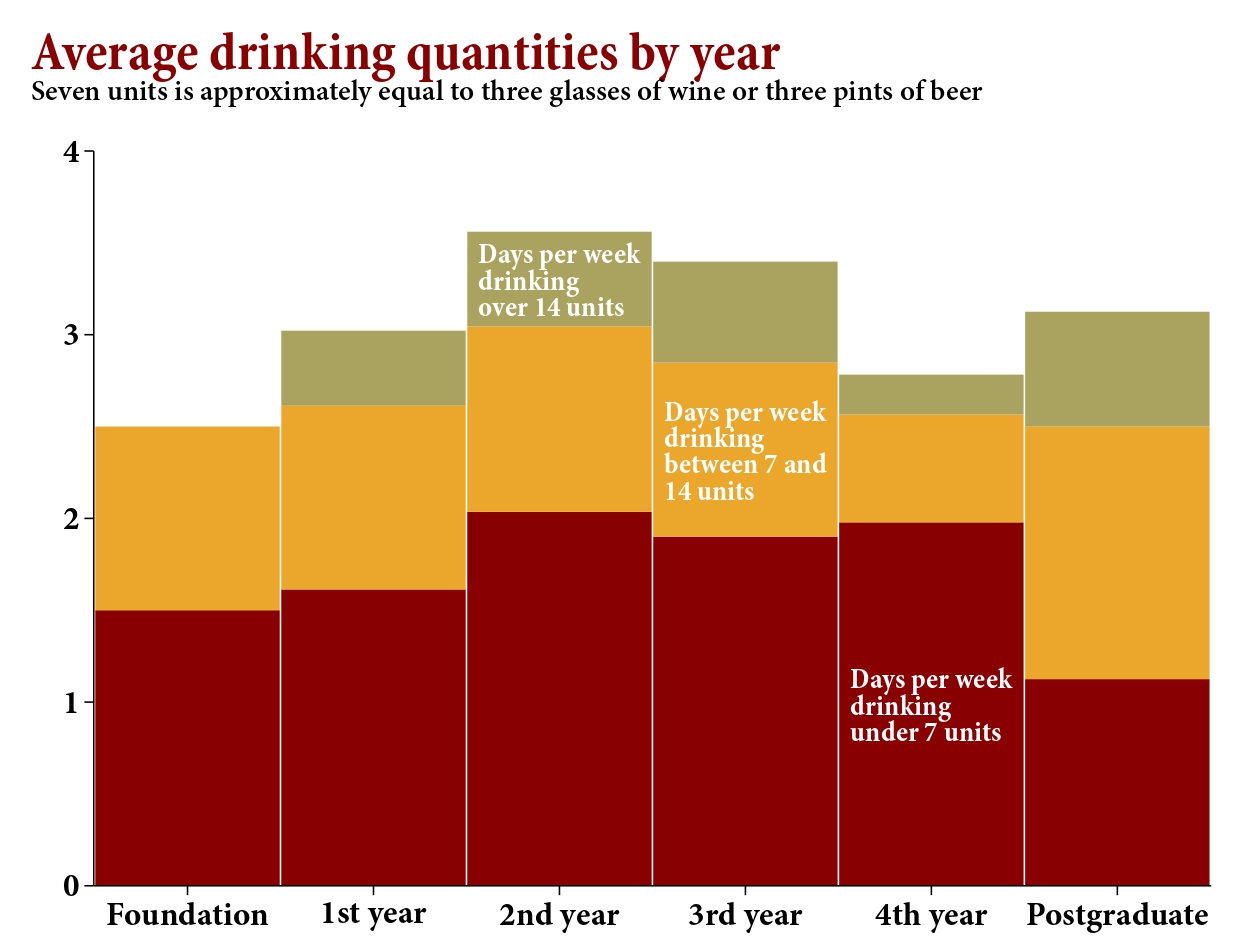 Before we begin, a note on data: it is difficult to work out how much people are drinking from a self-reported survey. Few consider their drinking in terms of units, but there aren’t many other reliable metrics from which it can be estimated. We went with the number of days drinking per week, with an additional question on how many days respondents drank specified numbers of units. We also asked how many days they had been drinking in week 4, in order to compare perception with reality (respondents were surprisingly on the money). In estimating intensity, we also looked at where people were drinking. As a result, this survey is not claiming to be a perfect encapsulation of every drop of alcohol consumed within Oxford. It’s a tour around attitudes, anecdotes, and habits in drinking.