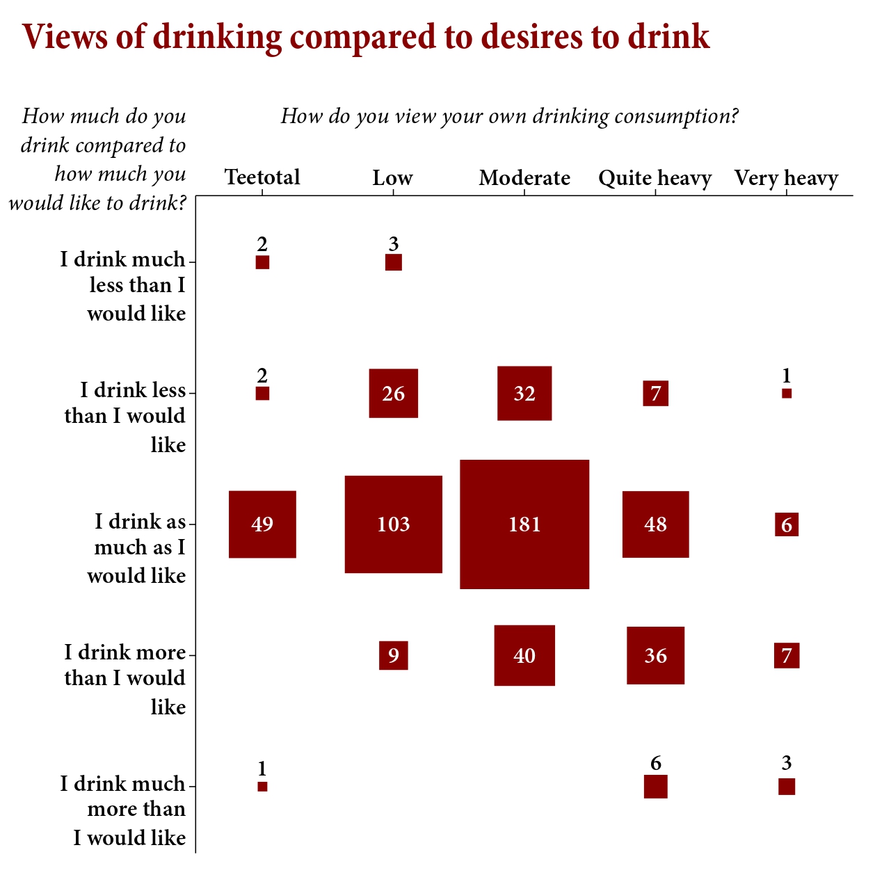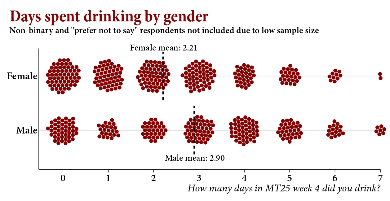 Yet self-perception tells a rosier story. Nearly half of respondents described their drinking as “moderate”, with 25.1% rating it “low”. Only 17.3% admitted to drinking “quite heavily”, and a mere 3% copped to “very heavy” consumption. This perception at least matches some reality. The “low” drinkers drank an average of 1.28 days in week four, the “moderate” drinkers an average of 2.9 days, and the very heavy drinkers reported drinking 4.8 days in the week. But while the amount drunk (and spent) increased, something decreased across these categories – satisfaction. 90% of teetotallers drank as much as they would like, and even moderate (73%) and quite heavy (50%) drinkers were broadly content. But of self-reported very heavy drinkers, 59% drank more or much more than they would like.
