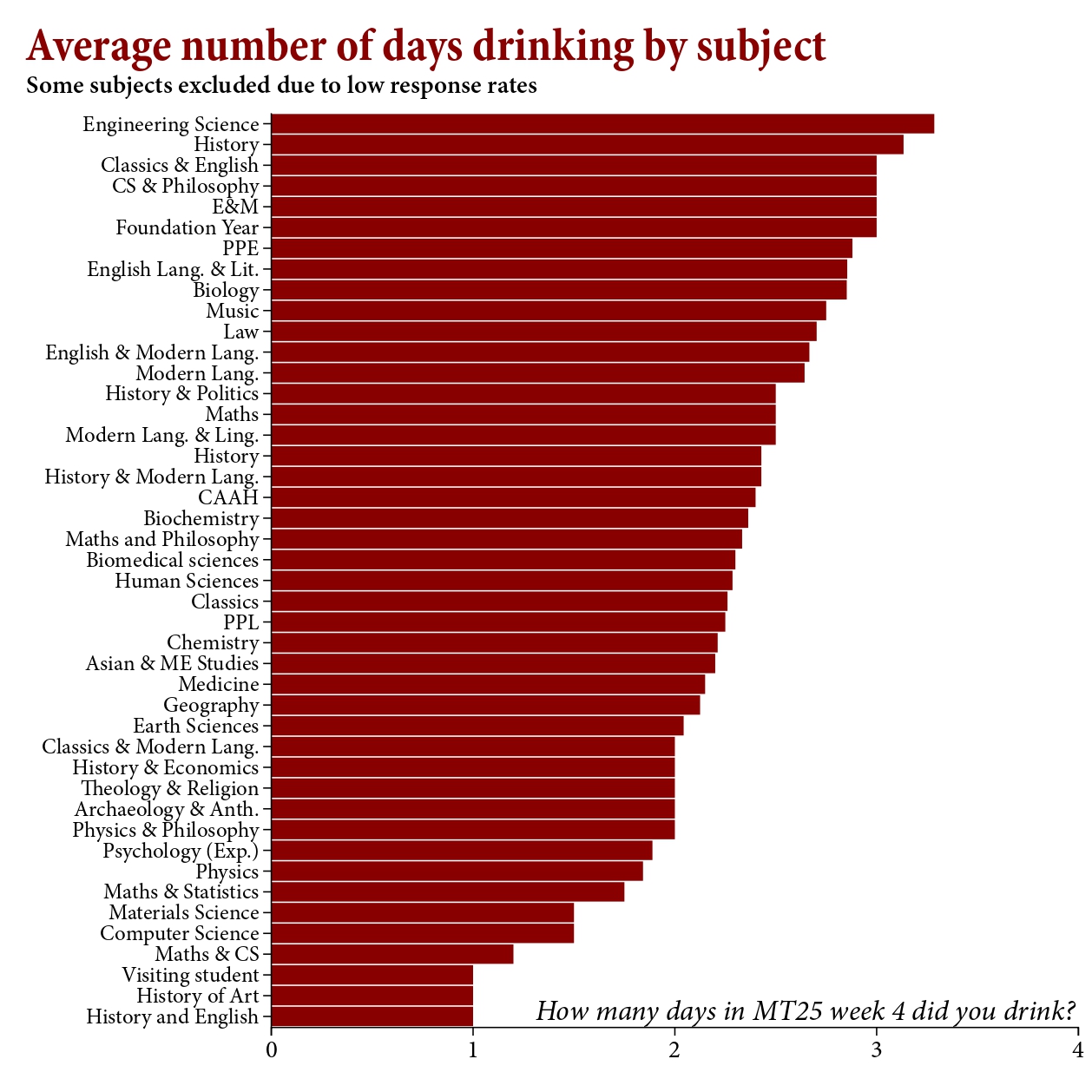 By contrast, climbing up the alcoholism ladder were Classics (2.65), the STEM-outlier Biomedical Sciences (2.65), English (2.85), History (2.88), PPE (3) and Law at an average of 3.08 days per week. The most intoxicated course, however, bucked all trends. With an average of 3.14 drunken days per week, Engineering Science students seemingly just can’t put the bottle down, topping the leaderboard as the drunkest degree. Not a great sign for our future buildings and bridges.