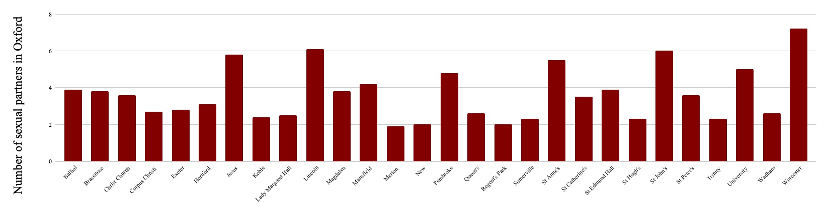 Worcester put in a good shift this year, proving to be the college with the highest average body count. They topped (wink wink) the ranking with a self-reported mean Oxford body count of 7.2. Credit where credit’s due though – this was mostly the work of one particularly industrious individual who reported an Oxford shag count of 92, the highest of all respondents. Lincoln and St John’s closely followed, getting hot and heavy with an average of 6.1 and 6 people, respectively. Less strong contenders included Regent’s Park and New, coming in joint second-last position with a mean of 2. It was Merton, though, that had the worst case of performance anxiety. They reported an average of 1.9 Oxford sexual partners, the lowest of all colleges that responded. This only confirmed pre-conceptions – Merton was voted by the most people as having the least sex.