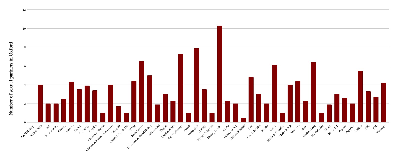 History and Modern Languages appeared to have the highest body count average – 10.3 – but this was skewed by the small sample size. Excluding this, Geography students hiked up to the summit, putting themselves on the map with a 7.9 average body count. It appears they were more focussed on getting frisky than on their fieldwork. Less dedicated to the cause was Human Sciences. They seem to have been more focused on the science than on the human. Our sources revealed that they have an average of 0.5 sexual partners at Oxford, officially making them the least horny course.